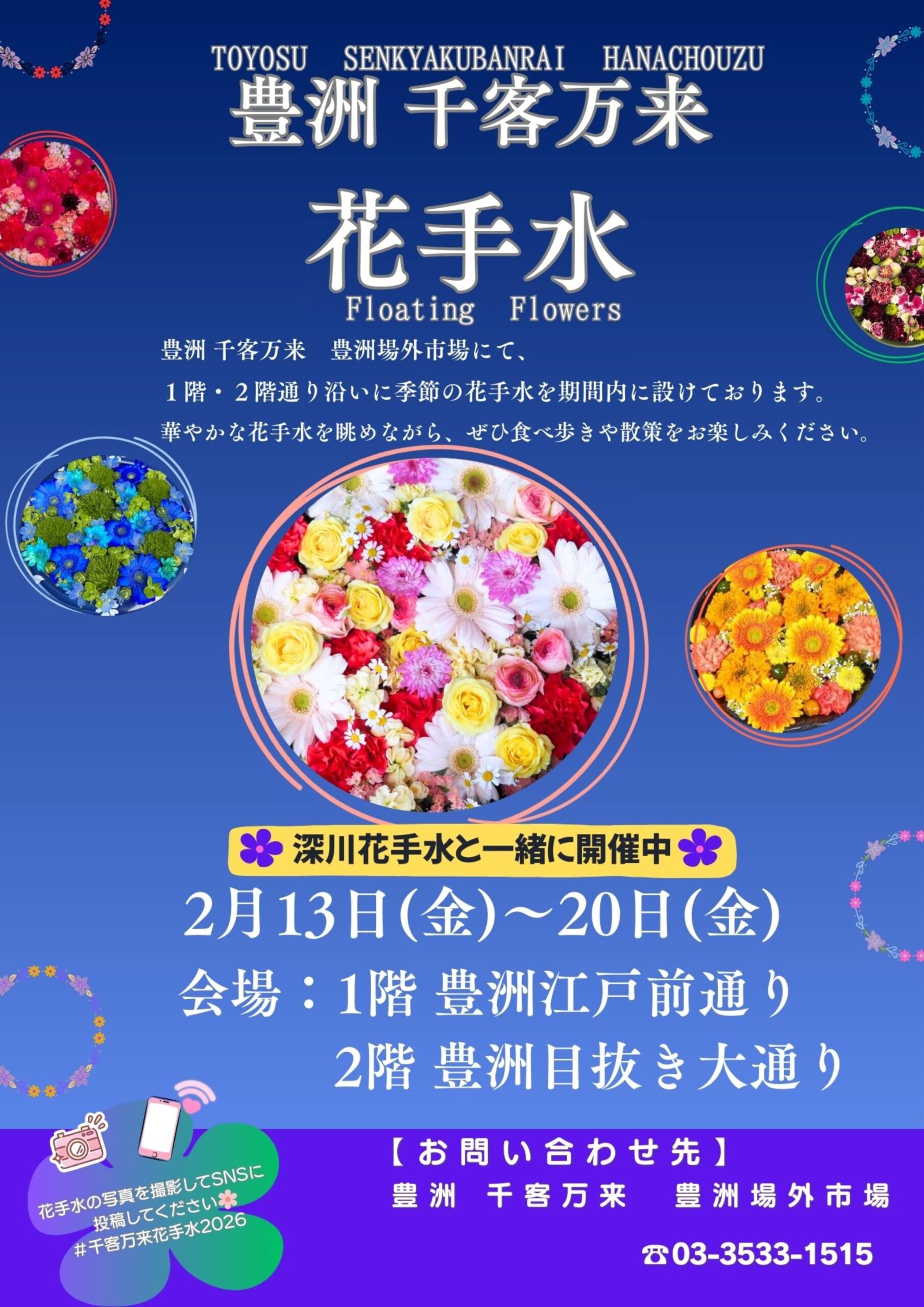1階 豊洲江戸前通り、2階 豊洲目抜き大通りを季節の花手水がお来場のお客様をお迎えいたします。