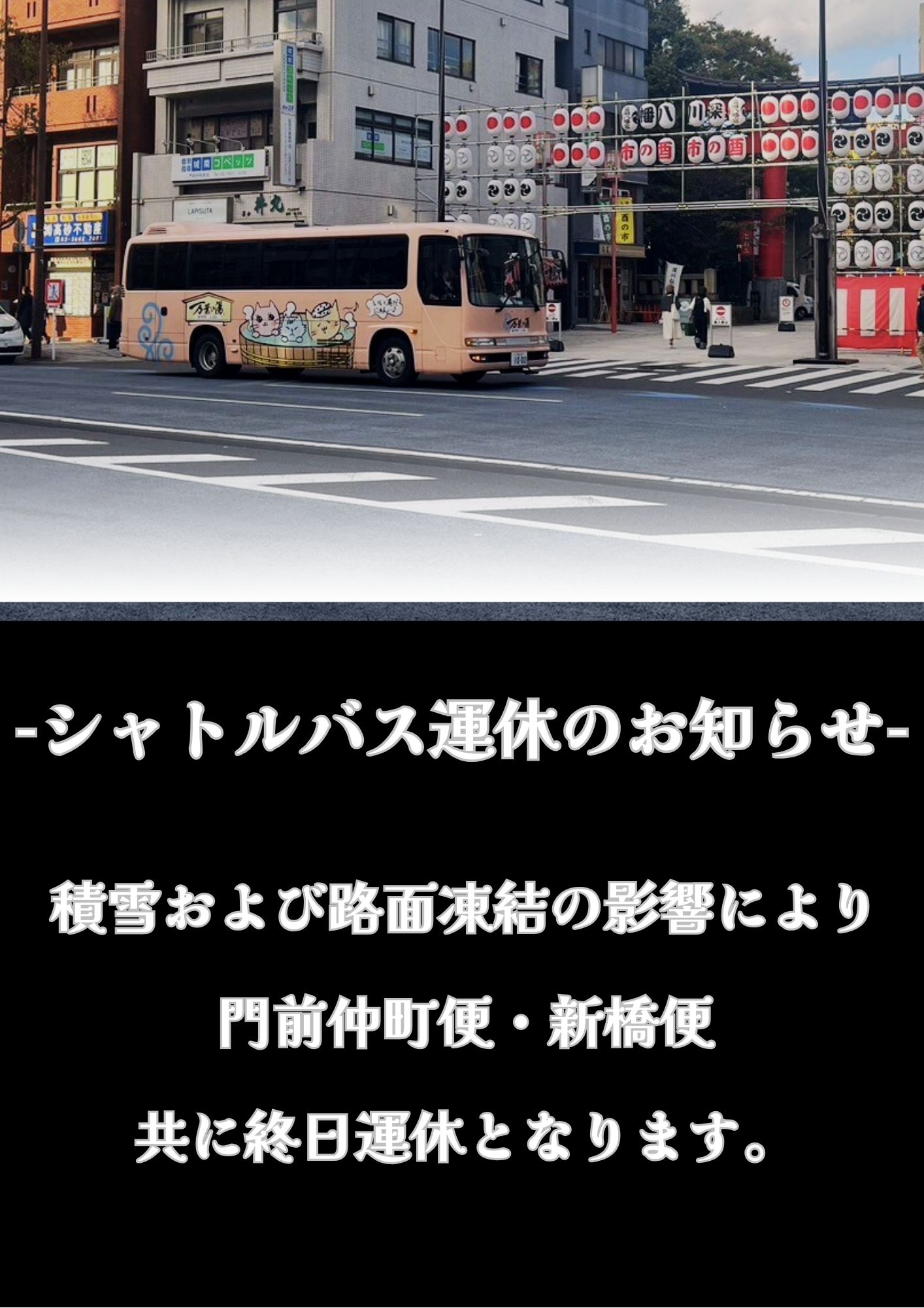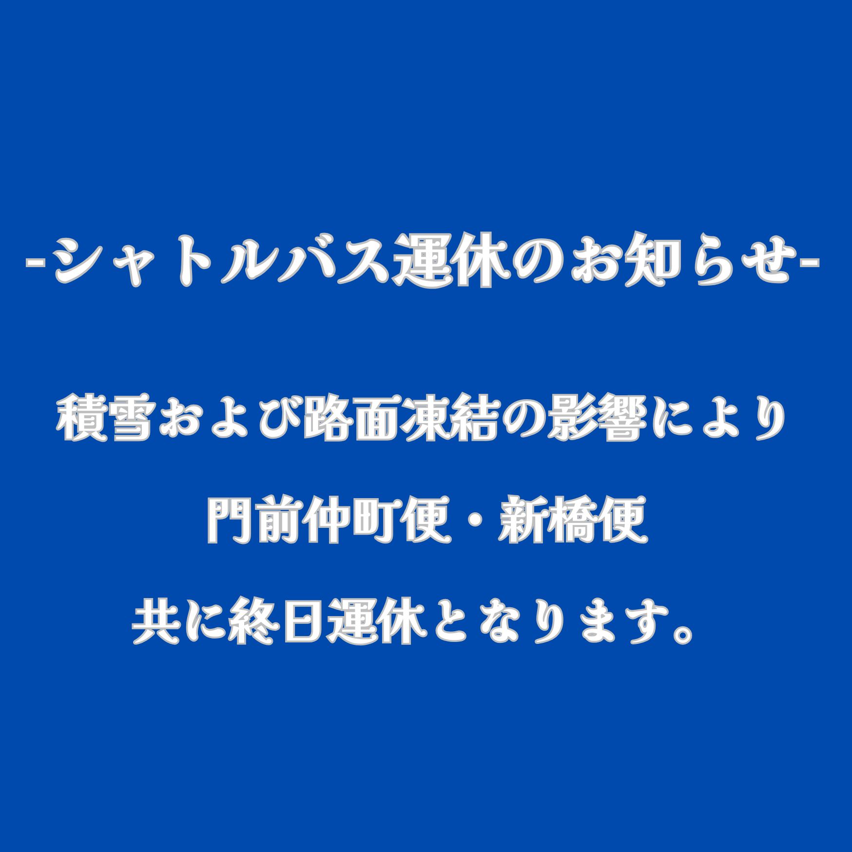 積雪および路面凍結の影響により、施設近隣の橋が通行止めとなっております。 そのため、本日(2/8)シャトルバスは運休となります。