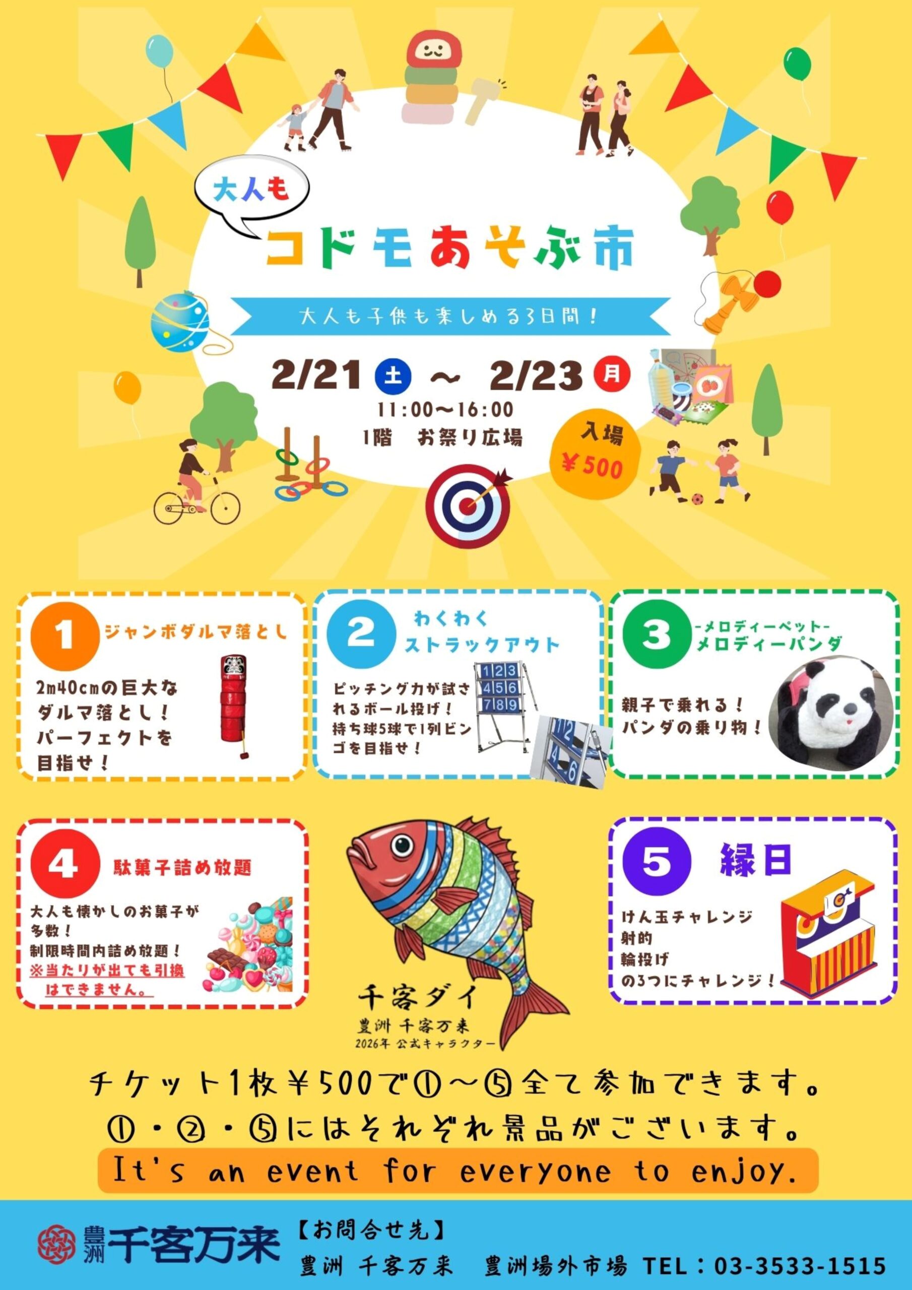 巨大だるま落としやストラックアウト、親子で乗れるメロディーパンダなど、