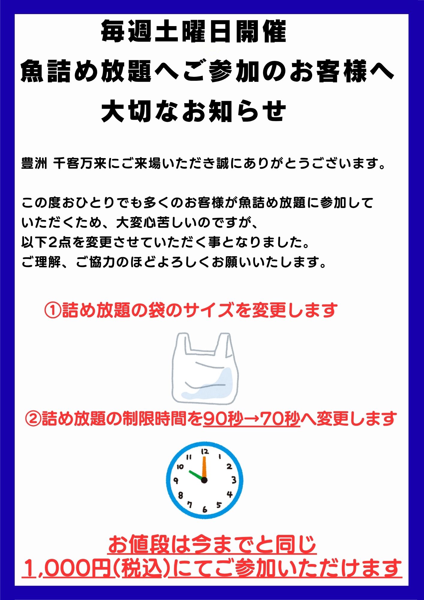 この度おひとりでも多くのお客様が魚詰め放題に参加して いただくため、大変心苦しいのですが、 以下2点を変更させていただく事となりました。 ご理解、ご協力のほどよろしくお願いいたします。